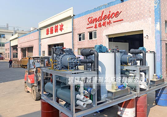 片冰機(jī)通電運(yùn)行,制冷劑(冷媒)通過(guò)壓縮機(jī)的做功變成高溫高壓的蒸汽工質(zhì),再流入冷凝器與外界換熱,放出熱量變成高壓液態(tài)工質(zhì),流經(jīng)過(guò)濾器過(guò)濾后通過(guò)膨脹閥降壓降溫為汽液混合狀態(tài),然后進(jìn)入蒸發(fā)器,與片冰機(jī)蒸發(fā)器內(nèi)壁上的水進(jìn)行熱交換,吸收大量的熱,使水急劇降到結(jié)冰點(diǎn)以下溫度,瞬速結(jié)冰。此時(shí)制冷劑經(jīng)過(guò)吸收熱量后蒸發(fā)成為氣態(tài),被吸入壓縮機(jī)內(nèi)進(jìn)行循環(huán),從而實(shí)現(xiàn)循環(huán)制冷。